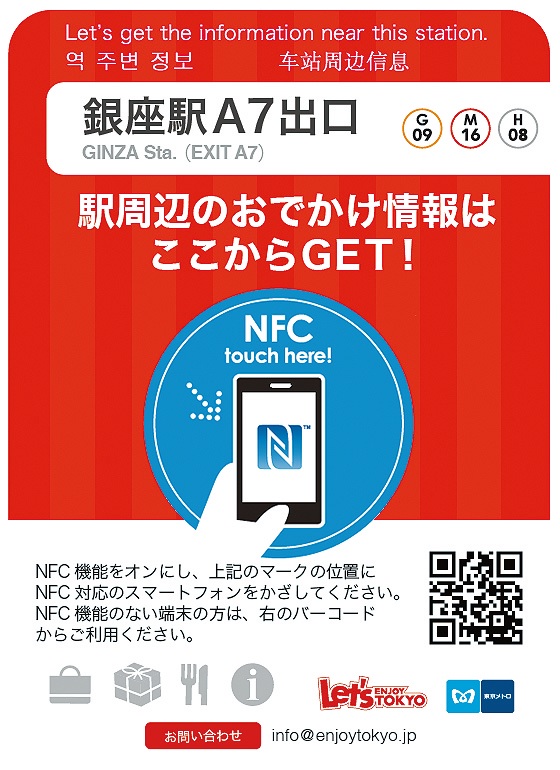 ぐるなびと東京メトロが展開する「レッツエンジョイ東京」は、NFCを活用した周辺おでかけ情報を配信するサービスのご紹介です。駅出入り口の案内看板にNFCとQRコードを併用したステッカーが貼られ、かざすと周辺の地図、観光、イベント、スポットや口コミ情報を閲覧することができます。